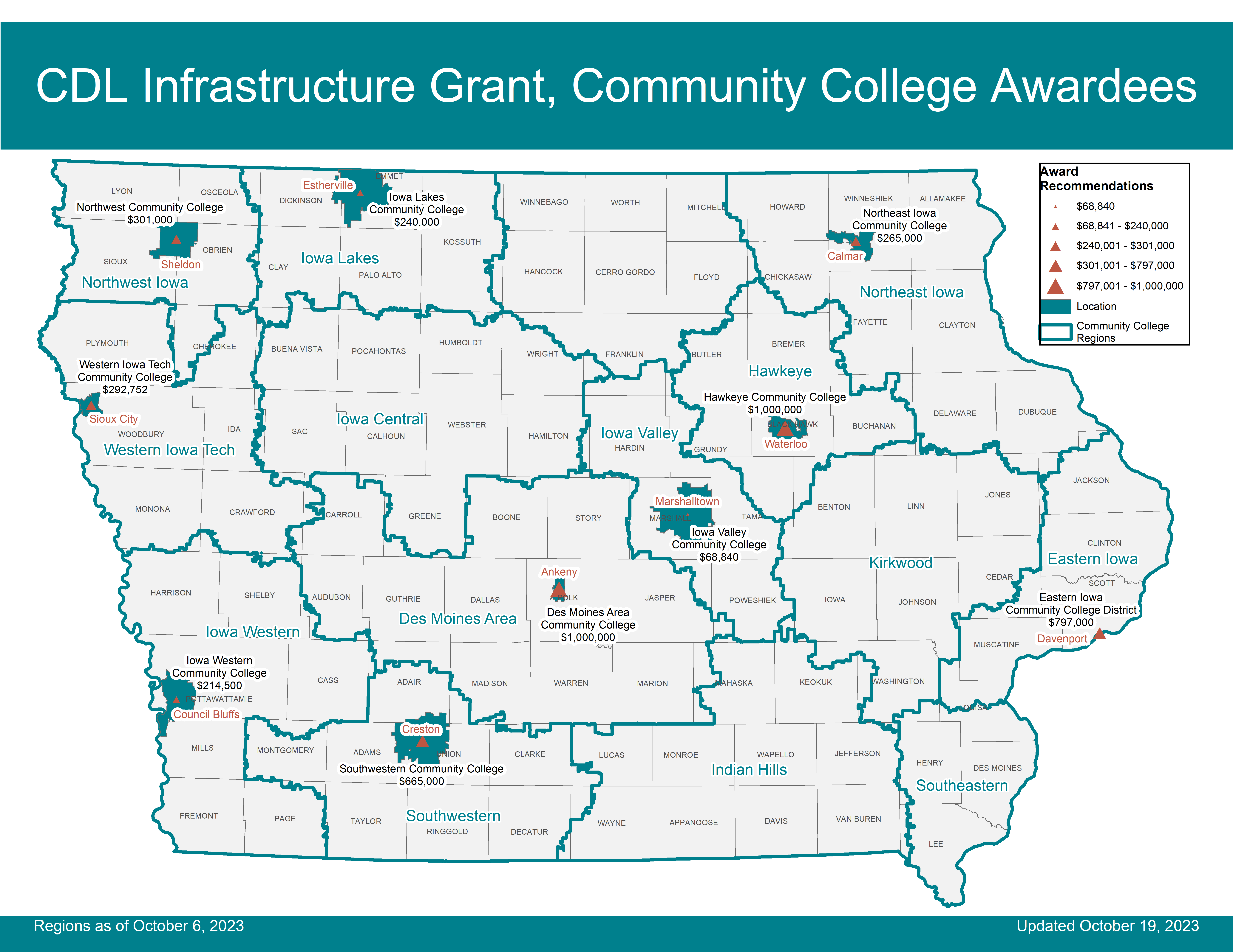 Novi program grantova za infrastrukturu CDL-a, koji je najavila guvernerka Kim Reynolds, pomaže društvenim koledžima u Iowi u izgradnji, kupovini ili preuređenju infrastrukture za obuku CDL-a.