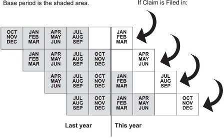 El período base son los primeros cuatro de los últimos cinco trimestres calendario completados al momento de la presentación de la solicitud inicial de beneficios de desempleo. Los cuatro a seis meses anteriores a la presentación de la solicitud no se utilizan para determinar la elegibilidad para el beneficio monetario.