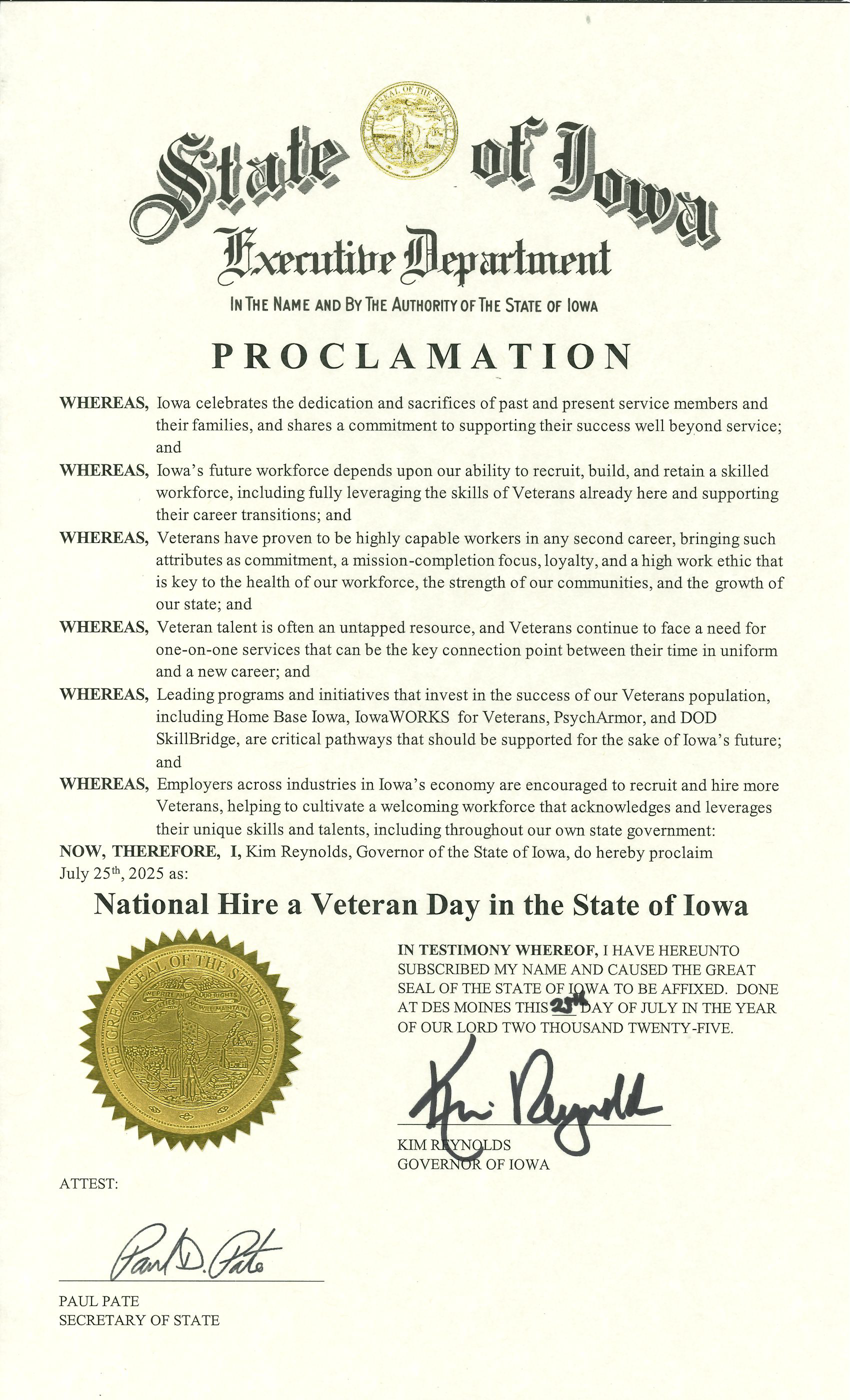 Le gouverneur Reynolds a récemment signé une proclamation visant à valoriser la Journée « Embauchez un vétéran » dans notre État ! Ce message rappelle aux entreprises et organisations locales le talent des vétérans et les compétences importantes qu'ils apportent de leur service militaire à de nouvelles carrières en Iowa.